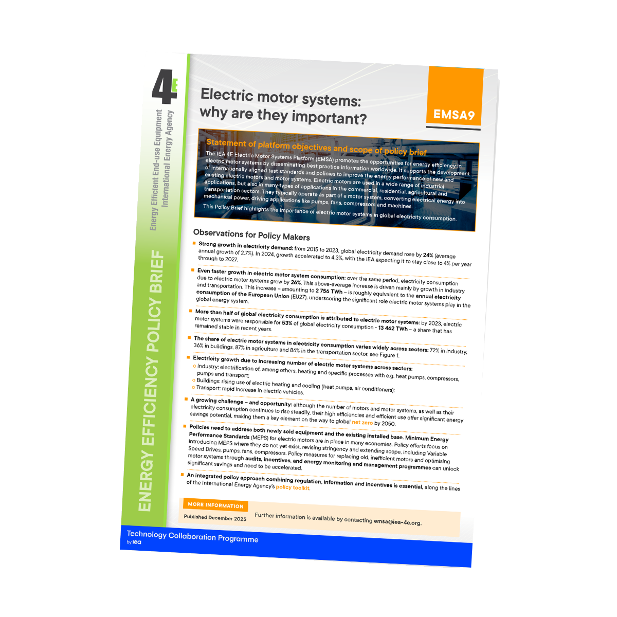 EMSA es la Plataforma de Sistemas de Motores Eléctricos del Programa de Colaboración Tecnológica de la Agencia Internacional de la Energía sobre Equipos de Uso Final de Eficiencia Energética 4E. Actualmente, Austria, Canadá, Dinamarca, Comisión Europea, Países Bajos, Nueva Zelanda, Suecia, Estados Unidos y Suiza participan en EMSA. Australia, China, Francia, Japón, Corea y el Reino Unido participan en 4E y otras plataformas 4E.